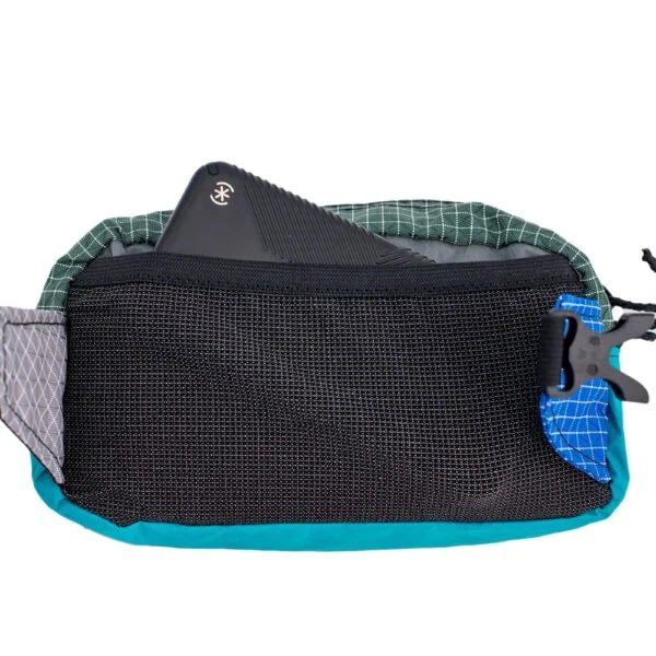 背面パネルにはジッパーなしのウルトラストレッチメッシュポケットを配置し、スマホや地図の取り出しや、移動中のスナックのゴミを安全に保管するのに便利です。